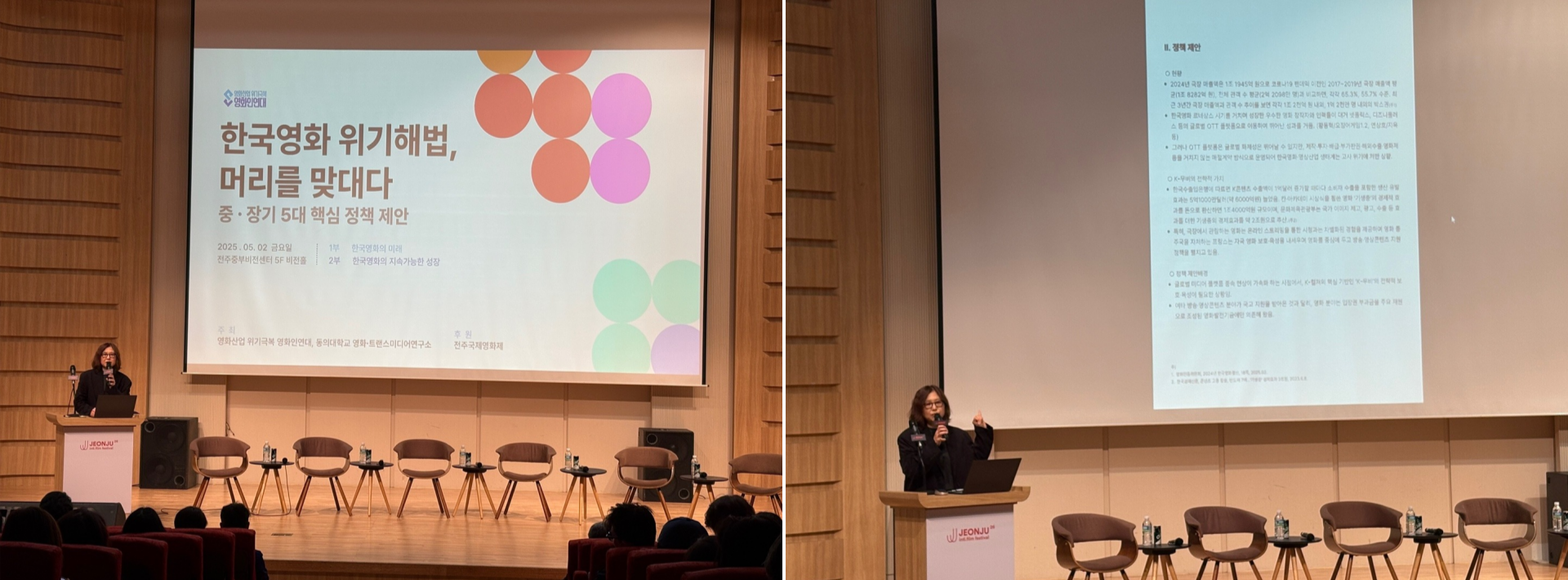 이처럼 총체적 위기 속에서 영화인들이 모여 새로운 질서를 다시 그려보자고 제안한 자리가 바로 [한국영화 위기해법, 머리를 맞대다 - 중·장기 5대 핵심 정책 제안] 영화인연대 포럼이다. 영화계 22개 주요 단체가 함께 준비하여 5월 1일 전주에서 진행된 이 포럼은 개별 현안을 넘어, 산업과 예술, 교육이 유기적으로 연결된 새로운 생태계를 상상하고 제안하기 위한 도약이었다. 단기 대응을 넘은 중장기 정책, 공공성과 지속 가능성을 아우르는 비전이 절실히 요구되는 지금, 이 포럼은 영화인들 스스로 다음 세대를 위한 정책 제안을 한다는 점에서 그 의미가 깊다.