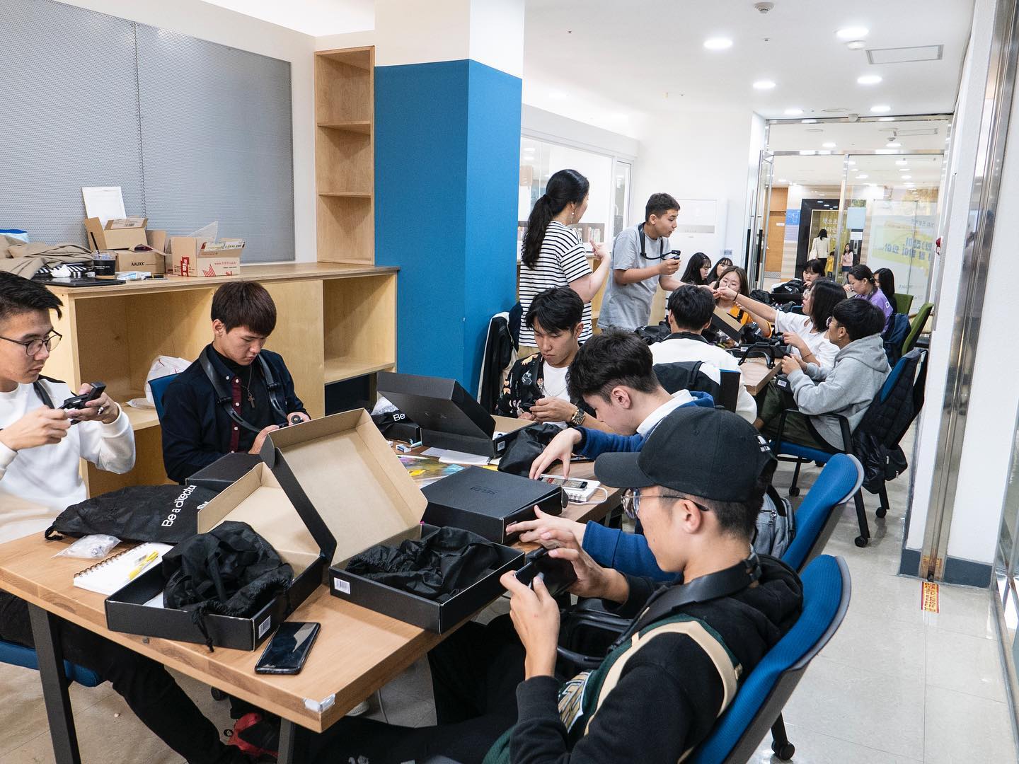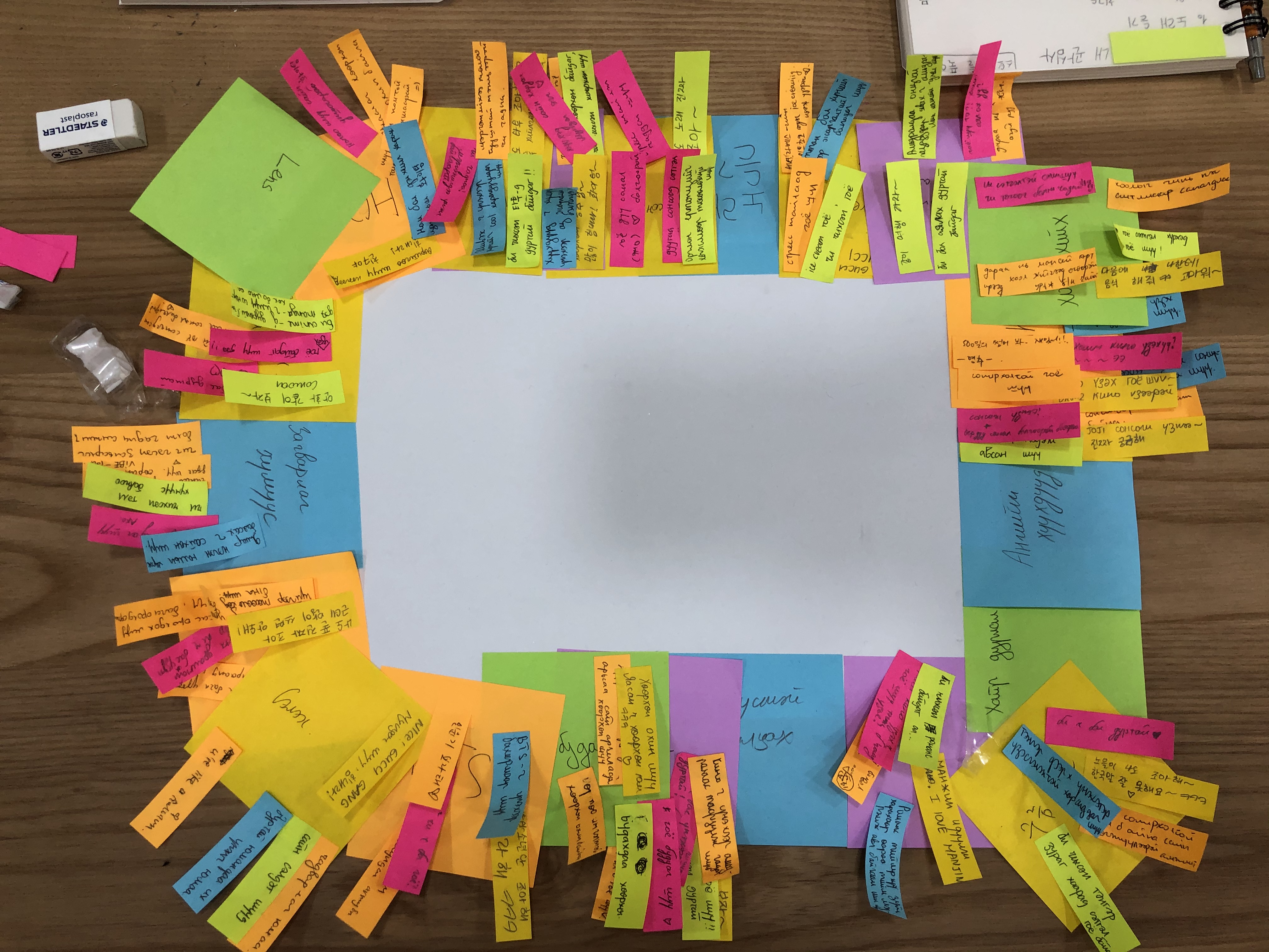 저의 소개로 시작된 수업은 아이들의 관심사를 알아보는 활동으로 이어졌습니다. 포스트잇에 좋아하는 것을 적고 모둠끼리 이야기를 나누는 활동인데, 글을 쓰고 말을 할 때 아이들이 모두 몽골어를 사용하기에 가능하면 한국어를 사용하자고 이야기했습니다. 그런데도 계속 몽골어가 들려 관찰해보니 아무래도 아이들에게는 모국어가 편해 보였습니다. 이후 영상제작기초 수업과 장비 테스트하는 시간을 가졌는데, 1인 1기기를 이용하여 작업할 수 있는 환경이어서 모든 학생이 1대씩 ‘셀디’를 활용할 수 있었습니다. 각자의 상자에서 ‘셀디‘를 꺼내 직접 조립하는 과정을 겪으니 활동이 풍부해지는 느낌이었습니다.