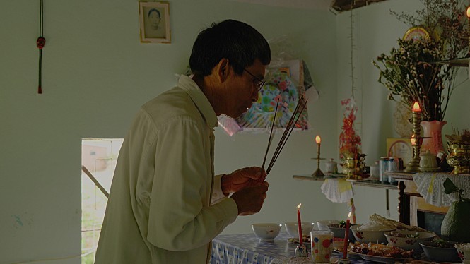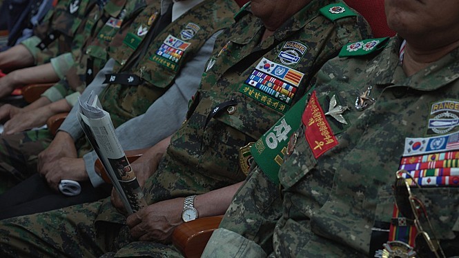 코다(CODA, Children of Deaf Adults)인 이길보라 감독이 이들의 목소리를 전달하는 것은 청각장애인인 자신의 부모님을 담아낸 전작 <반짝이는 박수소리>의 연장과도 같다. 딘 껌의 증언이 담긴 인터뷰 장면과는 달리, 그가 처음 등장하는 숏들엔 자세한 자막이 없다. 카메라는 그의 몸짓과 표정을 오롯이 담아낸다. 응우옌 티 탄이 등장하는 첫 장면은 자신의 손자를 돌보고 주방에서 요리하는 모습이다. 응우옌 럽은 마치 향을 꽂는 위치를 꿰고 있는 듯 제사를 지낸다. 이들의 언어는 (물론 베트남어가 포함되어 있지만) 수어, 필담, 그림, 표정, 그리고 오랜 시간 위령제를 드리며 몸에 베어버린 제스처들이다. 반면 한국으로 돌아온 참전군인들의 언어는 무엇인가? 한국을 찾은 응우옌 티 탄이 일본군 ‘위안부’ 피해자와 연대하는 장소 앞에서 군복을 입은 채 욕지거리를 날리고, 전몰장병 합동 위령제에서 무표정하게 눈을 감고 앉아 있으며, 시민평화법정에도 부대마크를 떼지 않는다. 세 피해자의 언어가 요청과 용서라면, 이들의 언어는 고함, 침묵, 거부이다.