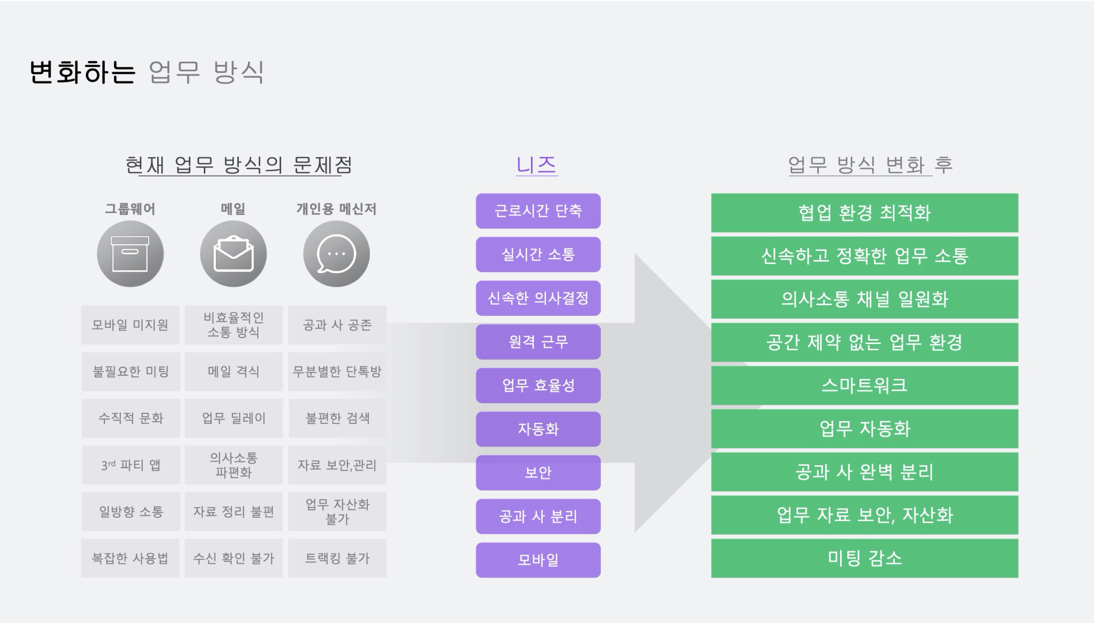 여럿이 일을 하면 자연스럽게 협업을 해야 한다. 다양한 유형의 파일을 생산하고 메일이나 메신저로 공유하며 의견을 교환하고 수정하고 저장해야 한다. 일정 공유나 외부와의 소통도 늘상 일어나는 일이다. 하지만 문서 생산 소프트웨어와 소통 플랫폼과 일정 관리 등을 개별 서비스에 의존하다 보니 몇 단계를 거쳐야 하는 불편함이 있고 즉각 수정하고 공유하기 어렵다는 한계가 있었다.