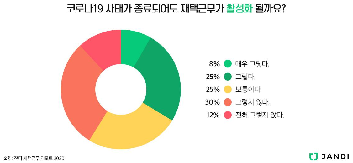 한 소프트웨어 업체에서 5월에 발표한 설문조사 결과에 따르면 재택근무를 경험한 직장인 중 절반 이상이 코로나19 사태가 끝나도 재택근무는 활성화될 것이라 예상했다. 불과 반 년 전만 해도 일부 직장이나 직종에서만 도입하고 대다수는 남의 일이라 생각했던 재택근무가 단기간에 일상적인 근무형태로 자리 잡게 된 것이다.