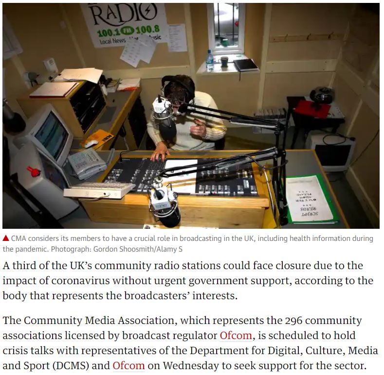 - 코로나19 팬데믹으로 인한 봉쇄조치로 영국의 공동체 라디오 방송국이 어려움에 처했다는 2020년 4월 가디언지 기사