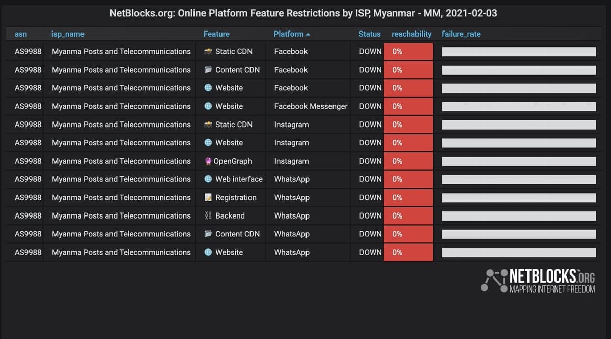 2월 3일이 되면 인터넷 차단이 아닌 개별 서비스에 대한 차단이 이뤄진다. MPT는 페이스북과 인스타그램, 왓츠앱 등 미얀마 청년들이 가장 많이 사용하는 소셜미디어 서버를 원천 차단했다. 이런 상황은 다음날까지도 지속됐다. 다음날인 5일에는 트위터 접근이 차단됐다.