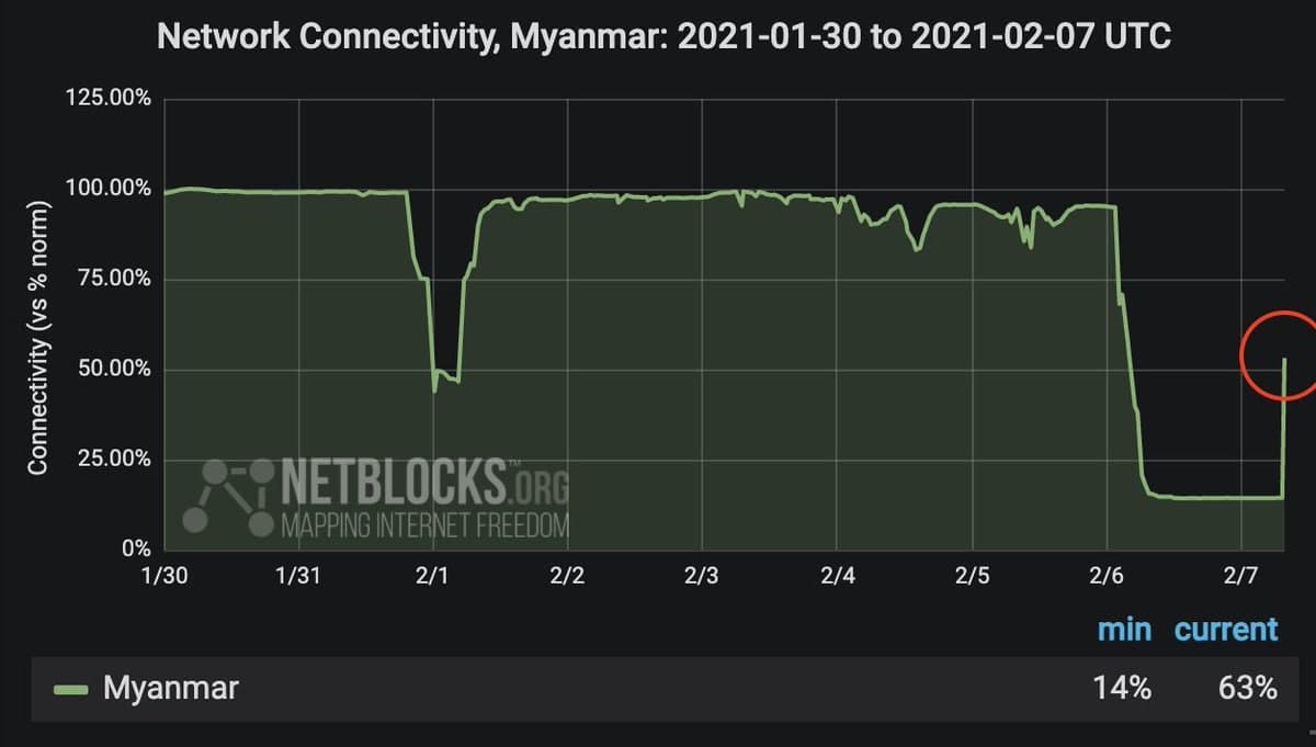한데 2월 5일에도 인터넷은 다시 전면 차단되었고, 이번에는 이전보다 훨씬 긴 시간동안 먹통이었다. 인터넷 연결이 재차 봉쇄된 것은 당일 양곤 도심에서 벌어진 대중 시위와 연관되어 있다. 15일에도 다시 인터넷이 차단되는데, 이 역시 노동자들이 쿠데타에 맞서 총파업을 개시한 것과 무관하지 않다.