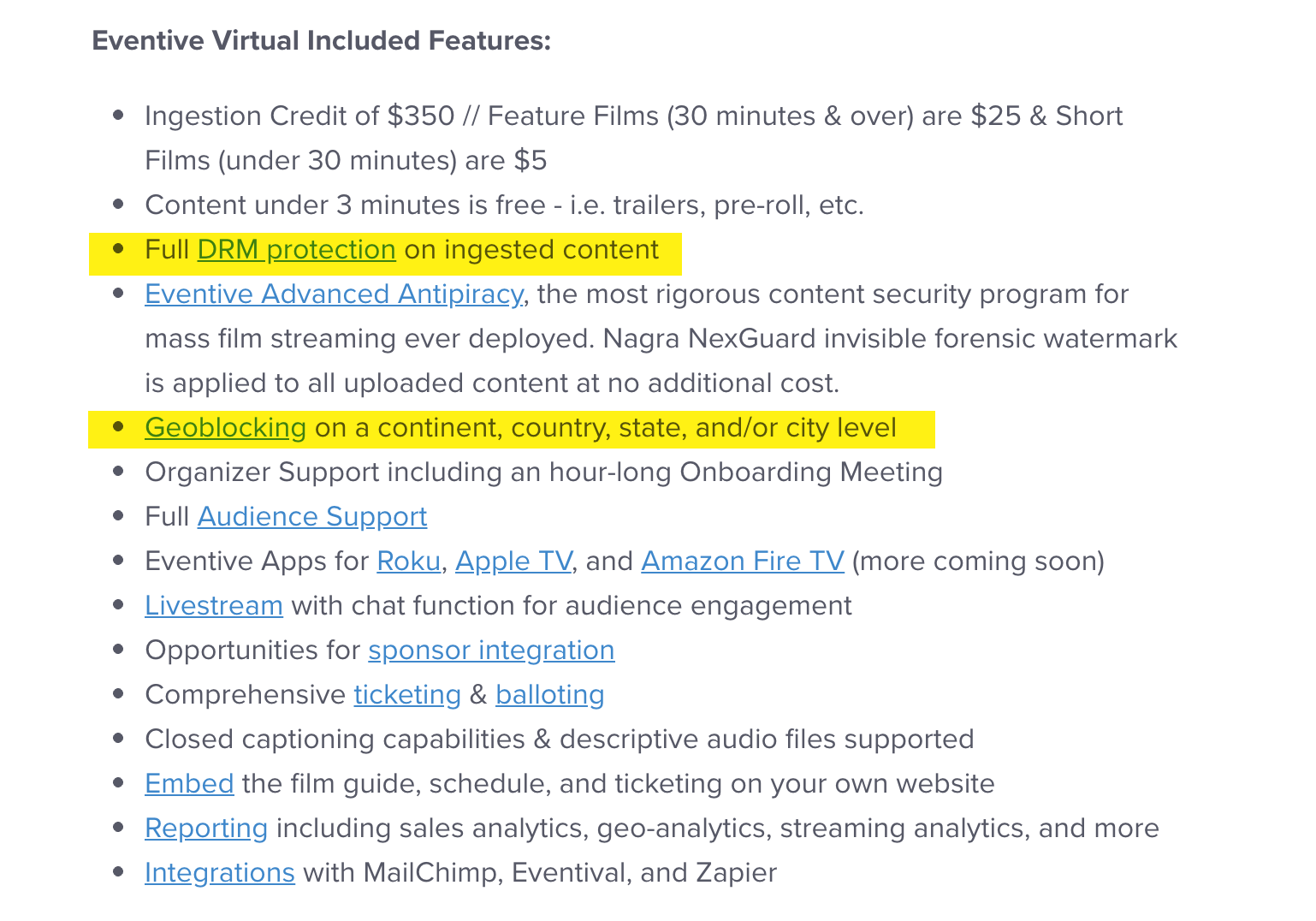 만약 영화제에서 온라인 상영을 위해 DRM보안과 Geoblock을 모두 제공할 때는 고민할 것이 없습니다. 이 경우 보통 영화제와 OTT 플랫폼이 계약을 하거나 영화제 자체에서 상영 플랫폼을 구축하기도 합니다. 미국 영화제의 경우 Eventive를 상영 플랫폼으로 쓴다면 위의 두 보안 기능이 제공된다고 보셔도 됩니다. 만약 감독님께서 '작품이 상영되면 좋겠다'라고 생각했던 곳에 이런 연락을 받았다면 걱정 없이 설레는 마음으로 배급을 진행하시면 됩니다.