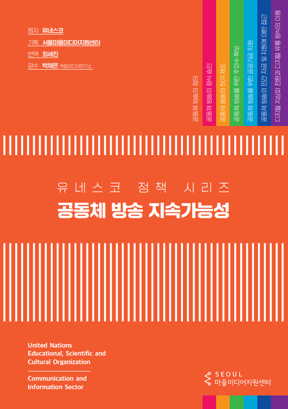 [편집자 주] <유네스코 정책 시리즈 – 공동체 방송 지속가능성>은 2015년 유네스코 행사를 통해 논의된 공동체미디어 지속 가능성에 관한 권고사항을 담아 발간된 책자입니다. 책자는 공동체 방송의 정의, 승인, 허가, 주파수 확보, 공공기금, 민간 자금, 디지털 전환 등 정책 전반을 다루고 있으며, 번역본 책자는 링크(https://readmore.do/yAfJ)를 통해 다운로드 가능합니다.