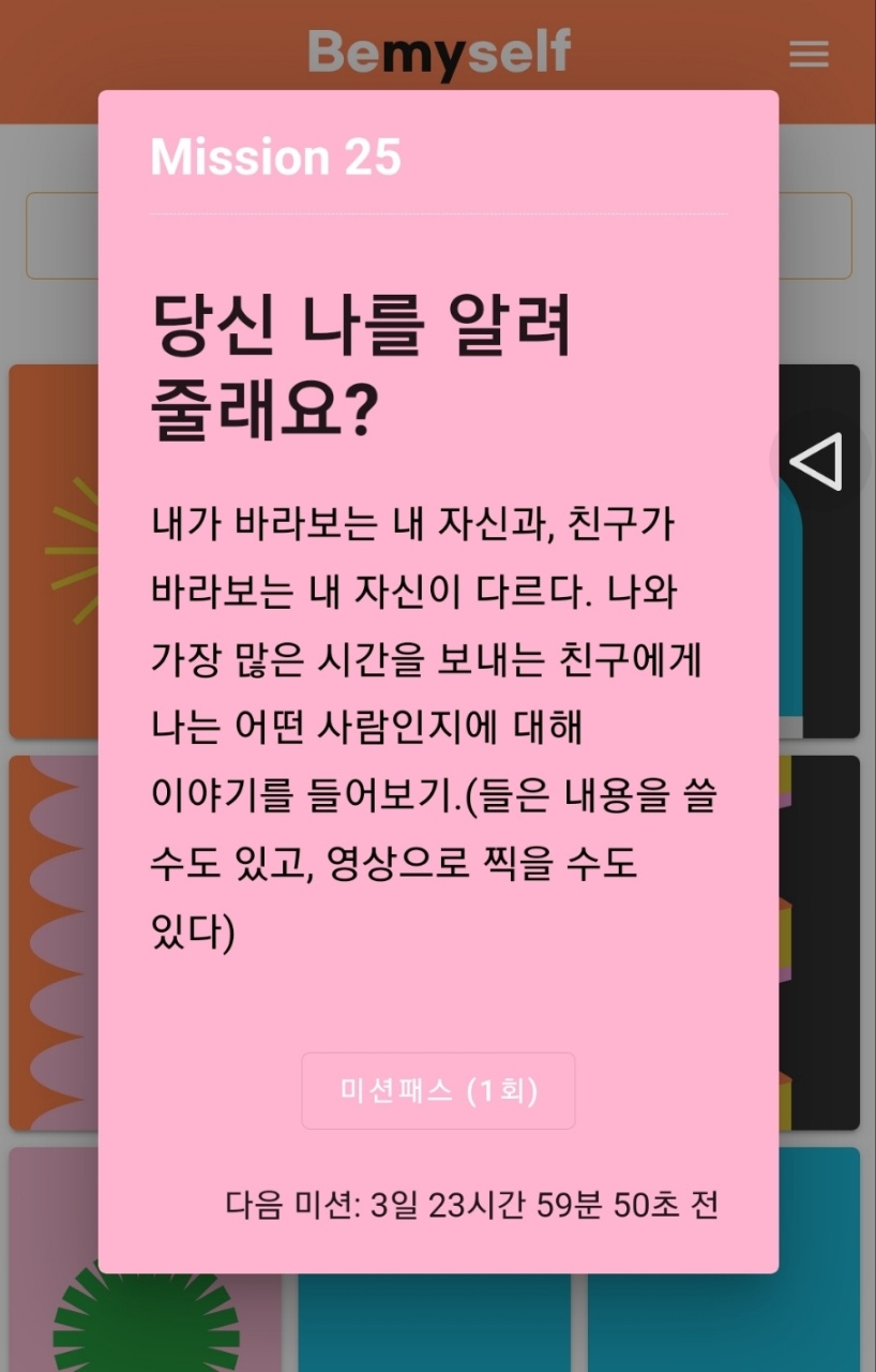 이후 1달 동안은 유스보이스에서 제작한 사이트를 가지고 발견 미션을 진행하였다. 사이트에서 카드 하나를 뽑아 나온 미션을 4일 이내에 진행하며 “나다움”에 대해 알아가는 활동이었는데, 가끔 생각지도 못한 엉뚱한 과제가 나오면 이런 걸로 나다움을 아는 게 가능할까 하는 의문이 들기도 했다. 일몰을 한 시간 동안 감상하거나 아날로그 제품을 분해하고 재조립해 보는 등 다양한 미션을 한 달에 걸쳐 경험하였는데, 평소 혼자 해보지 않았던 경험을 하면서 나를 위한 시간을 가질 수 있었다. 특별히 기억에 남았던 미션은 친구에게 나에 대해 물어보는 일로, 내가 생각하는 나와 타인이 생각하는 내가 상당히 다르다는 걸 알게 되면서 나 자신이 생각했던 만큼 형편없거나 부족한 사람이 아니라는 사실도 새로 알게 되었다.