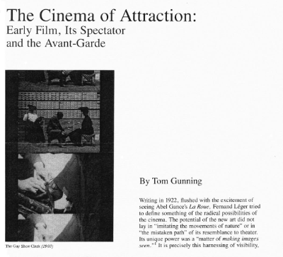 "톰 거닝이 밝히고 있는 논고의 목적은 1906년 이전의 영화들에서 두드러지던 ‘어트랙션’과 “초기 모더니스트들”, 즉 20세기 “초 아방가르드”와의 영향 관계, 그리고 서사 영화가 본격화되면서 이것이 전적으로 패퇴한 것이 아니라 “지하로 잠복하여 몇몇 아방가르드 작품들에 유입되거나 서사 영화의 한 구성요소로 나타나”는 등 유의미하게 존속해왔음을 조명하는 데에 있습니다."