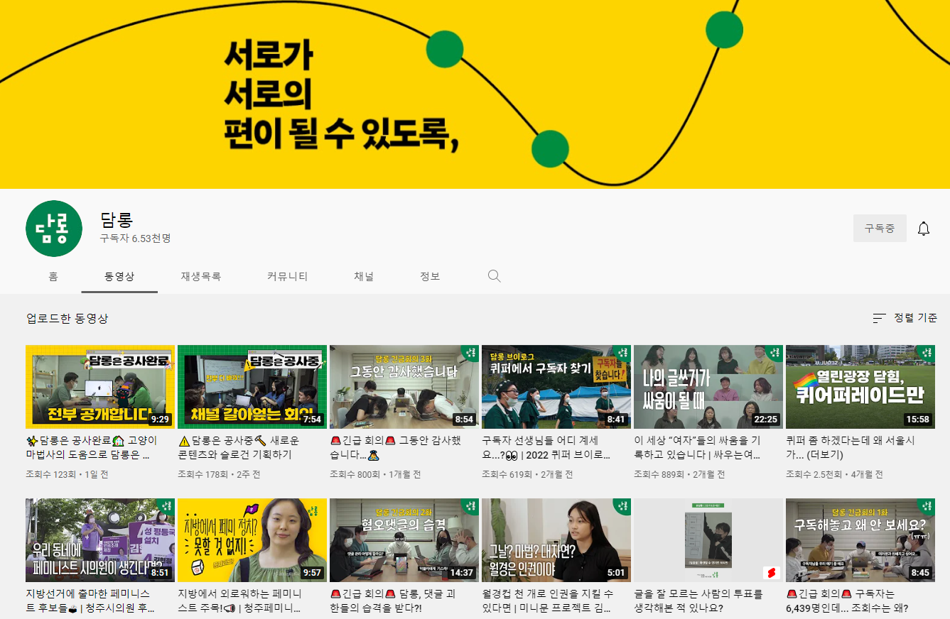 묵자) 저희가 이번에 슬로건을 새로 정했거든요. 전체적으로 리브랜딩을 조금씩 했어요. 그래서 아까 말씀드린 알음알음 알아가는 콘텐츠도 만들고 슬로건도 새로 정했는데 기존의 슬로건은 ‘우리는 더 길고 깊게 알아가야 돼’ 그거였는데 저희가 이번에 ‘서로가 서로의 편이 될 수 있도록’이라는 슬로건으로 새로 정했어요. 이 슬로건의 의미가 무엇이냐 하면은 ‘담롱’이라는 채널을 통해서 구독자, 인터뷰이 그리고 우리 PD들, 우리 팀원들이 같은 편이라는 느낌을 주고 싶다, 연결감을 주고 싶다 이런 생각을 많이 했었거든요. 저희가 긴급 회의를 통해 구독자분들의 응원을 많이 받아보기도 하고 오프라인에서도 만나보기도 하고 하면서 느낀 점이 우리가 이렇게 지금 흩어져 있고 유튜브 댓글 하나 아니면 좋아요 하나로밖에 소통을 하지 못하는 관계이기는 하지만 그래도 우리는 같은 편이다 이런 느낌, 이런 감각을 주려고 많이 생각을 하는 것 같아요. 그래서 그런 고민들을 담아낸 회의의 콘텐츠들도 이번 주에 올라갈 거거든요. 그런데 이미 이 인터뷰 올라갈 때 했을 때는 올라와 있겠네요.