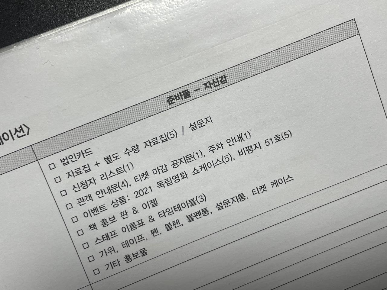 독립영화 쇼케이스 준비 과정을 차례대로 적어 봤다. 빠트리면 안 되는 중요한 일들 위주로 적고 자잘한 업무들을 보탰다. 처음에서 마지막까지 과정과 절차가 매끄럽게 나열됐다. 한 해 동안 열두 번의 독립영화 쇼케이스 상영회를 마쳤고, 이제 상영회를 진행하는 데에 익숙할 거 같지만 상영회는 잘 만들어진 매뉴얼대로 되는 법이 없었다. 예기치 않은 일들이 벌어졌고, 상영회마다 고민의 지점이 옮겨 갔다.