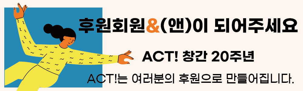 [Me. Dear]에서는 현장 투쟁에 결합하고 계시는 분들의 목소리를 담았습니다. ACT! 128호 미디어 활동가 은석님 인터뷰에서 ‘외국인보호소 폐지를 위한 물결 International Waters 31’(이하 IW31)‘ 관해서 잠시 언급된 바 있었는데요. IW31에서 최근 실천 활동을 하고 계시는 정여름님이 단체에서의 활동과 경험에 대해 작성해주신 글을 만나보실 수 있습니다. 강정원님은 을지OB베어 투쟁에 참여하고 계신 경험을 진솔하게 공유해주셨습니다. 어떠한 연대체에 속하지 않아서 선뜻 결합하기 망설여지지만, 연대하고 싶은 분들에게 하나의 나침반이 될 수 있지 않을까 싶습니다. 박상헌님, 김예찬님, 윤아랑님께서는 [Re:Act!] 코너에 흔쾌히 문답을 작성해주시며 ACT!에 힘이 되는 말을 전해주셨습니다.