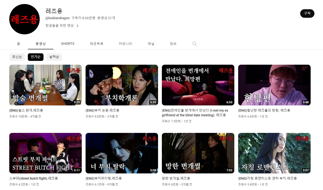 촬영 후에 그제야 채널 이름을 고민했었습니다. 레즈용, 뼈레즈, 왕레즈, 용스무비 등등 별의별 아이디어가 나왔는데, 한국에서 ‘레즈비언’이라는 단어에 대한 거부감이 조금이라도 덜어질 수 있도록 채널 이름에 ‘레즈’란 단어를 꼭 넣고 싶었습니다. 그래서 제 이름 끝에 비슷한 것과 레즈가 합쳐져 레즈용이 되었고, 레즈 전용, 레즈 드래곤, 레즈 + 제 이름 이런 여러 가지 의미를 담게 되었습니다.