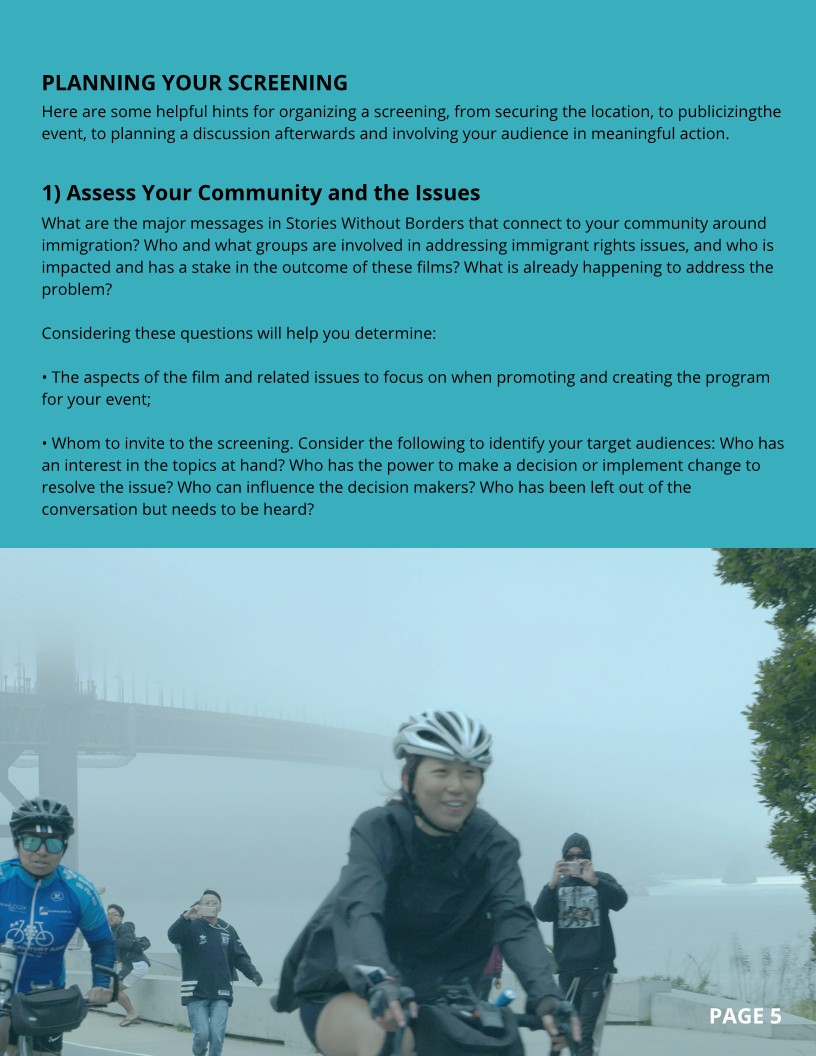 ‘Stories Beyond Borders’는 위에서 소개한 ‘Docs in Action’의 한 프로젝트로, 2019년~2020년 경 ‘이민자 정의’에 관한 다양한 관점을 다루는 5개의 단편 영화를 큐레이팅하고 상영한 프로젝트이다. 영화는 단순히 다양한 지역에서 상영된 것이 아니라, 지역 사회 기반의 다양한 공동체, 단체와의 참여와 파트너십을 통해 상영될 수 있었다. 공동체 상영의 방식으로 43개 도시와 15개의 주에서 상영될 수 있었다. 약 6천여명의 관객이 참여하였으며, 상영 이후에는 관객과 함께하는 영화의 주요 주제에 대한 토론(45분~1시간)이 함께 진행되었다.
