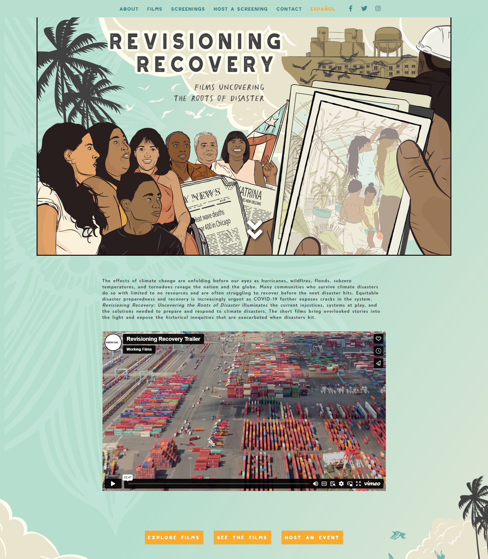 ▲ (좌) 교도소 내 산업단지 폐지 운동에 대한 5개 영화를 지원한 ‘Beyond Walls’ 프로젝트 사이트, (우) 기후 재난의 대비 및 회복과 무관하지 않은 사회적 불평등의 문제를 조명한 6개 영화를 지원한 ‘Revisioning Recovery’ 프로젝트 사이트. 홈페이지에서 주제 및 단편영화 소개, 진행 중인 상영 정보를 찾아볼 수 있으며, 상영회 주최 또한 신청할 수 있다.