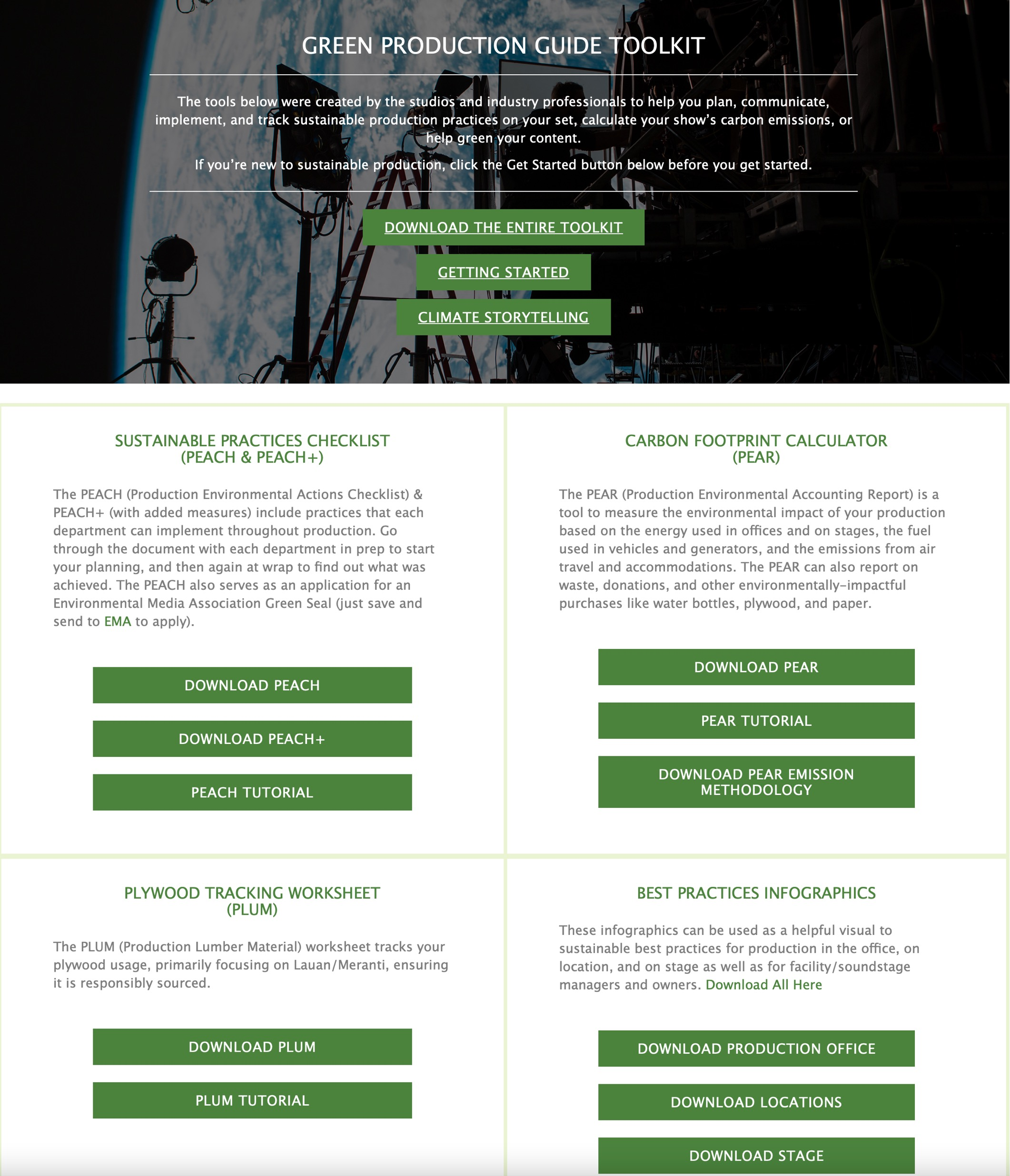알버트 툴킷 보다 더 많이 쓰고 있고 가장 많이 이야기되는 건, 미국의 프로듀서 조합인 PGA(Producer's Guild of America)와 헐리우드 스튜디오가 함께 제작한 Green Production Guide입니다. 이 가이드는 2010년에 만들어졌는데요, 세 가지 부분으로 구성됩니다. 첫 째는 탄소발자국을 계산할 수 있는 것, 두 번째는 각 부서별, 단계별로 친환경적인 것을 활용하고 있는 지 체크하는 것, 세 번째로는 목재의 출처와 사용처를 추적할 수 있는 전표입니다. 홈페이지에 들어가면 누구나 엑셀파일을 다운받을 수 있습니다.