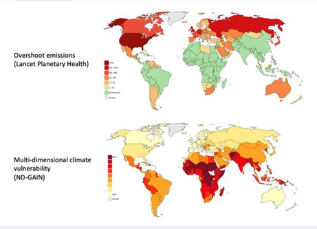 이 발제의 주요한 문제인식의 기반인 기후 정의부터 정리하겠습니다. 기후 정의의 개념은 남반구와 북반구의 개념에서 시작된다고 합니다. 위 그림의 첫 번째 지도는 색이 빨갈수록 탄소 배출량이 많습니다. 자본주의가 발전한 북반구는 탄소의 대부분을 배출하고 있습니다. 남반구는 그에 비해 절대적으로 탄소배출량이 적습니다. 그럼 두 번째 지도를 보겠습니다. 두 번째 지도는 기후 위기 취약 지역일수록 빨갛습니다. 취약 지구는 남반구에 모여 있고 특히 적도 근처에 모여 있습니다. 배출량이 많은 곳은 북반구인데 기후 위기 취약 지역은 전부 남반구에 모여 있습니다. 마치 반전을 시킨 듯이 역전되어 있습니다.