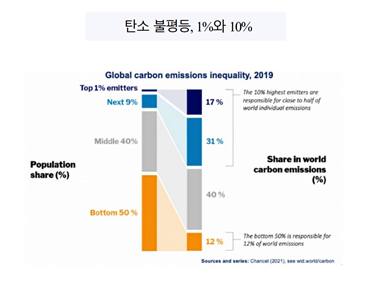 이 표를 통해 계급별 배출량에 대한 추이를 볼 수 있습니다. 10% 인구의 탄소 배출량이 전체 탄소 배출량의 절반을 차지합니다. 위의 지도와 함께 생각하면, 왜 탄소 배출량이 적고 환경오염이 적은 계층이 더 고통을 받아야 되는 지 질문하게 됩니다. 이 문제가 남반구와 북반구의 문제만이 아님을 알 수 있습니다. 북반구에 살고있는 저소득층 농민들, 청소년들, 노동자들도 훨씬 배출량이 적은데 역시 기후 취약층이 됩니다. 작년 130년만의 서울 폭우에 반지하방에서 희생된 건 공교롭게도 민주노총 소속 노동자였습니다. 기후 위기 관련한 협상 테이블이 만들어져야 하고 대응책 마련을 위해 최전선의 주체들이 협상 테이블에 앉아야된다는 것이 기후정의의 관점에서 문제를 해결하는 방식임을 이송희일 감독은 소개하고 있습니다.