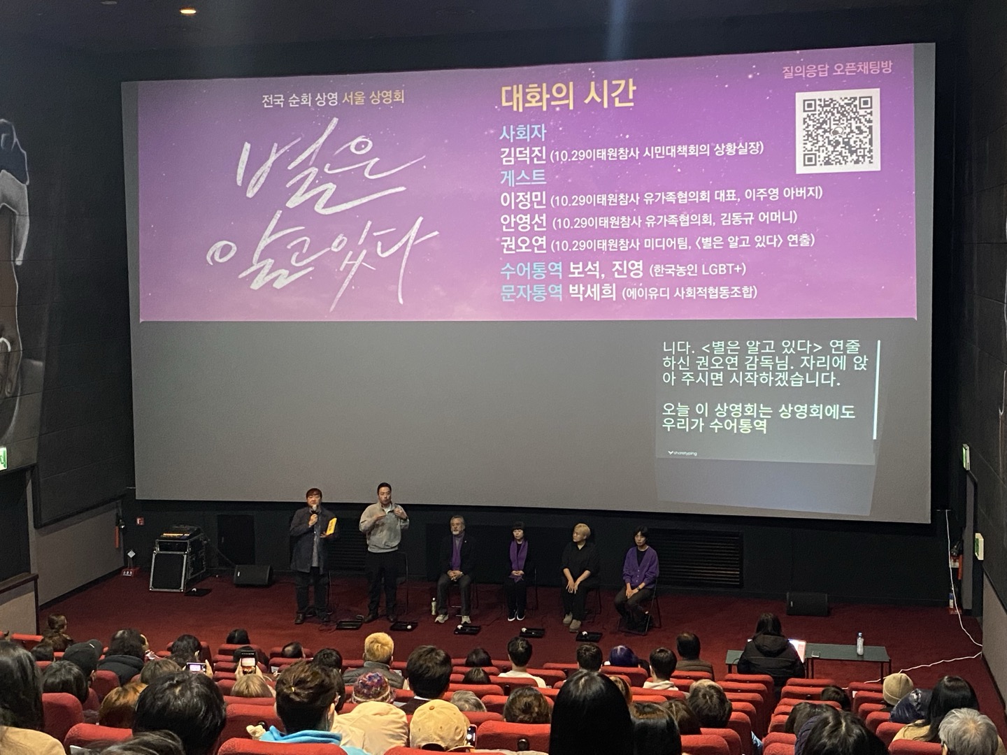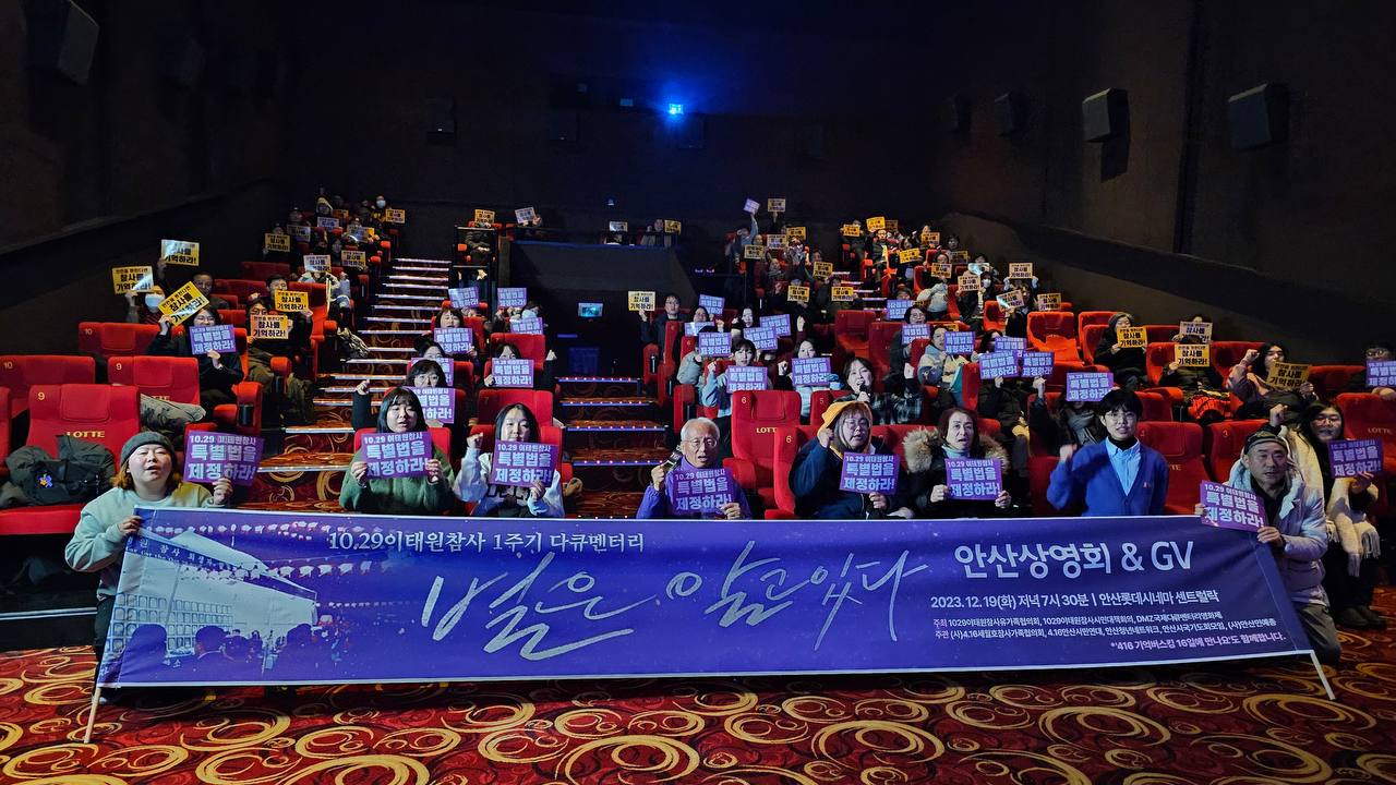 오연 전국 순회 상영은 10.29이태원참사시민대책회의 상황실에서 대관 상영을 진행했어요. 시민과 만나는 일종의 광장 같은 자리를 영화관에서 만들었던 건데요. 안동, 부산, 사천, 대전, 대구 등 18곳을 도는 전국 순회 상영이었어요. 서울 인디스페이스에서 시작해서 전국을 돌고 다시 인디스페이스에서 마지막 상영하고 끝나는 일정이었습니다. 별개로 지금도 공동체 상영 신청을 받고 있어요. 단체나 학교, 일터에서 신청해 주시면 상영하실 수 있게끔 파일을 보내드려요. 저희가 공간 대관을 지원해드릴 수는 없지만 상영 후 토크나 GV에는 함께하고 있어요. 제작진도 가고, 유가족분들 섭외도 도와드려요.