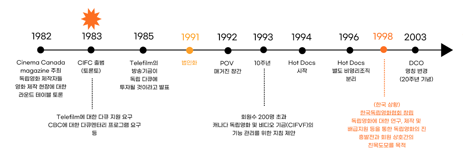 CIFC가 법인화가 진행된 시기(1991년)의 한국 상황은 어떠했을까. 한국의 경우 CIFC와 가장 닮은 조직은 한국독립영화협회(KIFV) 인 듯 하다. 한국독립영화협회는 독립영화에 대한 연구·제작 및 배급지원 등을 통한 독립영화의 진흥 발전과 회원 상호 간의 친목도모를 목적으로 1988년 창립되었다. 두 조직 간의 법인화 시기는 7년 정도 밖에 차이가 나지 않지만 캐나다와 한국의 공영방송 및 공적기금 지원 등과 관련한 생태계 구축은 상당한 격차를 보인다. 계속해서 캐나다 DOC의 활동을 살펴보자.