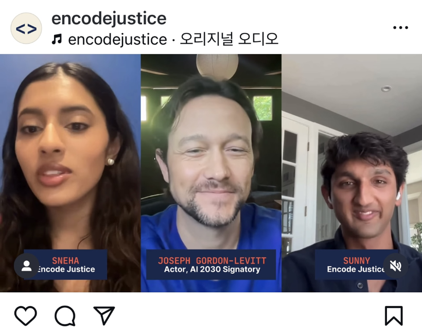 <AI 2030> 선언은 2030년까지 더 많은 지도자들이 실행해주기를 바라는 의제로 제시되었지만, 동시에 젊은 세대들이 2030년까지 추진해야 할 정책 목표이기도 하다. 또한, <AI 2030> 선언은 AI에 대한 대중의 일반적인 내러티브를 바꾸는 중요한 전환점이 되고 있다. 실제로, 배우 조셉 고든 레빗의 지지 성명을 그와의 줌 인터뷰로 인스타에 올리며, AI 전문가나 정책 지도자가 아닌 개인의 서사로 대중을 설득하는 계기를 만들었다.