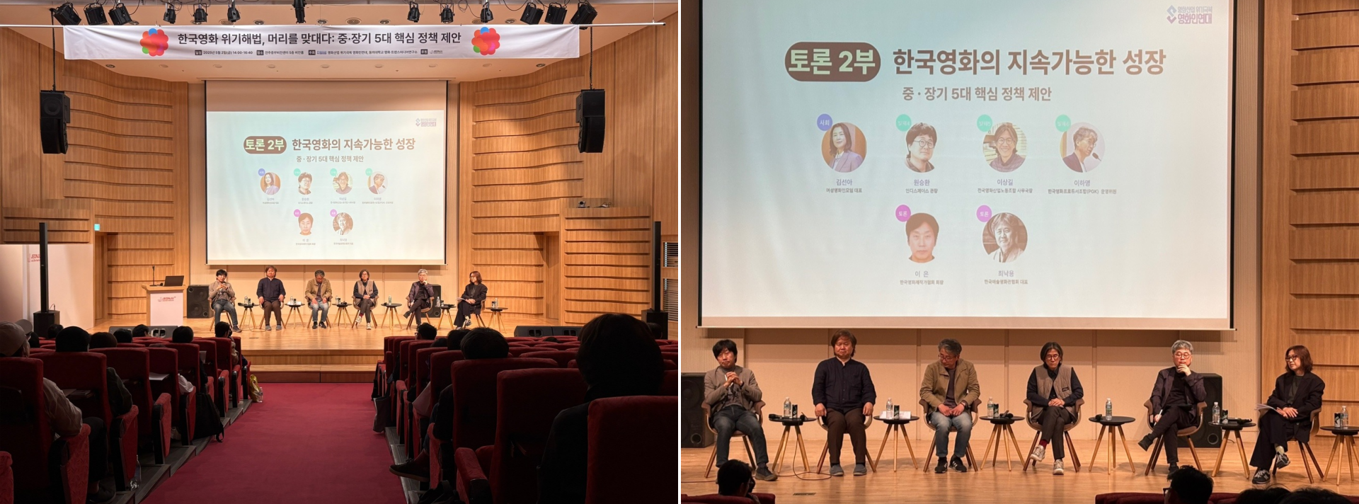 이처럼 총체적 위기 속에서 영화인들이 모여 새로운 질서를 다시 그려보자고 제안한 자리가 바로 [한국영화 위기해법, 머리를 맞대다 - 중·장기 5대 핵심 정책 제안] 영화인연대 포럼이다. 영화계 22개 주요 단체가 함께 준비하여 5월 1일 전주에서 진행된 이 포럼은 개별 현안을 넘어, 산업과 예술, 교육이 유기적으로 연결된 새로운 생태계를 상상하고 제안하기 위한 도약이었다. 단기 대응을 넘은 중장기 정책, 공공성과 지속 가능성을 아우르는 비전이 절실히 요구되는 지금, 이 포럼은 영화인들 스스로 다음 세대를 위한 정책 제안을 한다는 점에서 그 의미가 깊다.