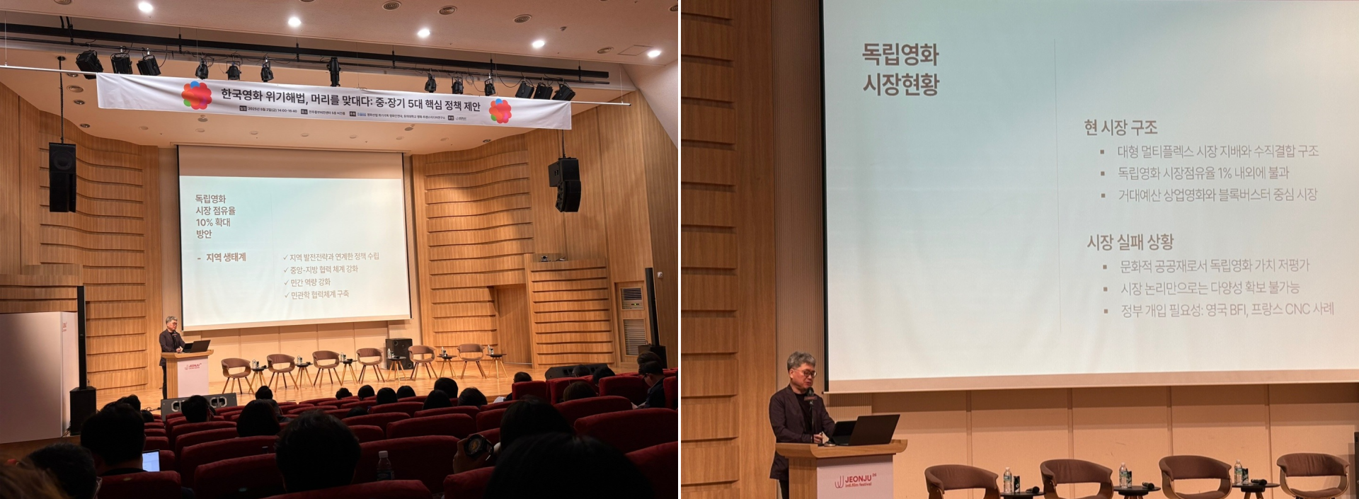 원승환 인디스페이스 관장은 독립영화 시장 점유율을 1%에서 10%로 확대하기 위한 정책 전환의 필요성을 강조하며, 단순한 제작 지원을 넘어 관객의 실제 관람으로 이어지는 ‘유효수요’를 창출해야 한다고 주장했다. 그는 프랑스, 미국 등 해외 사례를 통해 두 자릿수 점유율이 독립영화 생태계의 자생적 발전을 가능하게 하는 임계점임을 설명하고, 케인즈 경제학의 유효수요 개념을 바탕으로 상영 기회 부족, 정보 단절, 접근성 문제 등 수요의 장벽을 제거하는 정책이 필요하다고 제안했다. 이를 위해 독립영화를 ‘지원 대상’이 아닌 ‘발견과 공감의 문화상품’으로 재정의하고, 관객 중심의 인프라 확대, 디지털 전환, 지역 생태계 강화, 글로벌 진출 전략 등을 종합적으로 추진해야 한다고 강조했으며, 특히 독립영화 회원제 구축 구독 모델인 ‘인디 필름 패스’ 같은 제도적 장치를 통해 관객의 접근성을 높이고, 영화발전기금의 40%를 독립영화에 할당해야 실질적인 생태계 전환이 가능하다고 밝혔다.