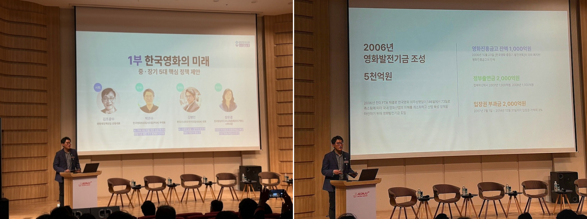 박관수 한국프로듀서조합(PGK) 부대표는 한국 영화산업이 겪고 있는 재정 기반의 붕괴를 정조준하며 발제를 시작했다. 그는 2006년 한미 FTA로 촉발된 영화발전기금의 역사와 함께, 코로나19 이후 급감한 관객 수로 인해 입장권 부과금 기반의 기금 시스템이 한계에 직면했다고 진단했다. 특히 최근 영화기금이 체육기금, 복권기금 등 타 기금에 의존해 연명하는 구조는 지속 가능하지 않으며 영화산업을 위한 독립적이고 안정적인 재정 구조가 시급하다고 강조했다. 이에 대한 해법으로 그는 정부 출연금, 복권기금 법정 배분, 입장권 부가세 면제, OTT·방송에 대한 연발기금 부과 등을 조합해 5년간 1조 원의 집중 투자를 실행할 것을 제안했다. 더불어 중예산 영화 지원 확대, 기획개발 생태계 회복, 펀드 운영의 공공책임 강화 등도 병행되어야 한다고 역설했다.