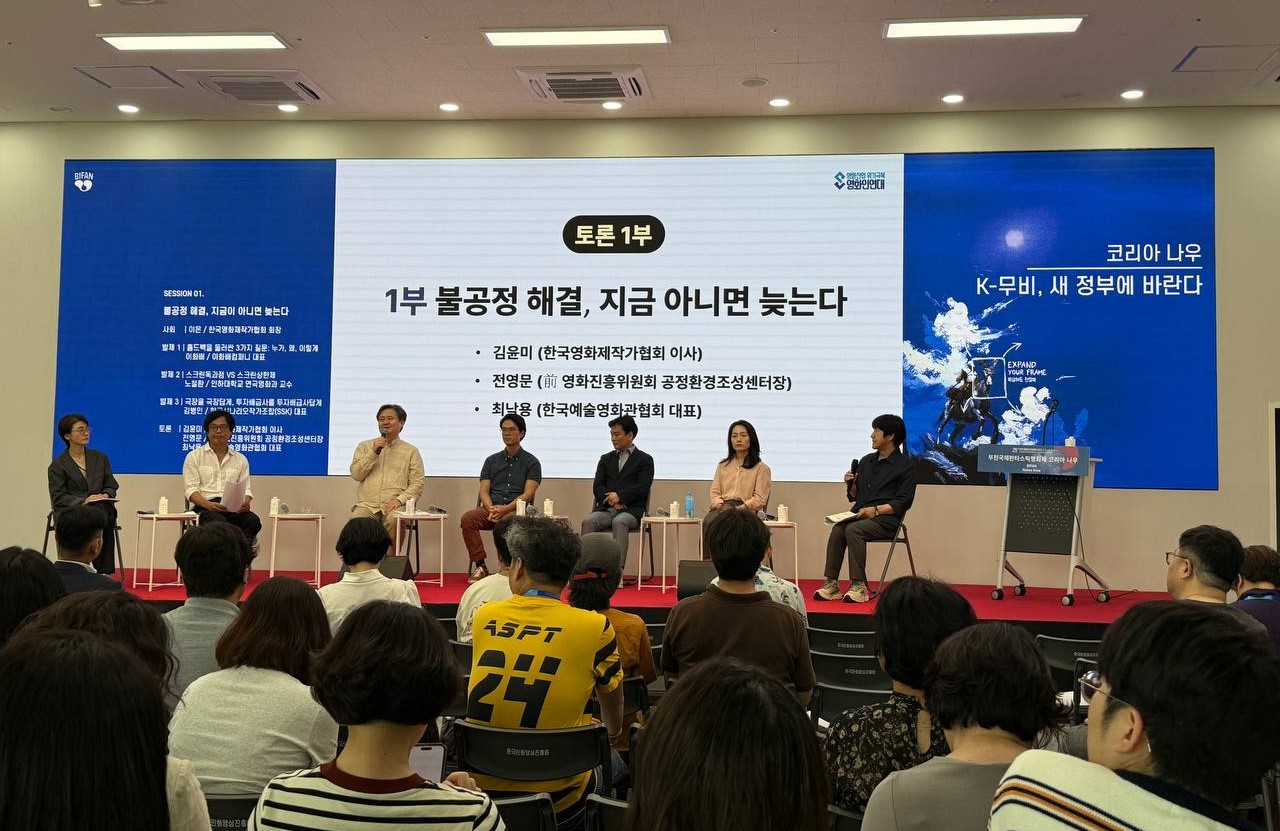 1부 토론은 발제자 3인과 토론자 3인의 참여로 진행되었다. 다양한 영화가 관객에게 도달하지 못하는 불공정한 유통 구조의 문제를 바탕으로, 제도 개편과 정책 제안, 영화인들의 연대와 기록의 필요성이 주요 의제로 다뤄졌다. 최낙용 한국예술영화관협회 대표는 강변 CGV 개관 당시의 기대와 현실의 괴리를 언급했고, 전영문 전 영화진흥위원회 공정환경조성센터장은 OTT 관련 제도 개선이 내부 저항과 부처 간 권한의 한계로 좌절된 경험을 공유하며, 정책 실현을 위해 영화계 내부의 실천과 연대가 선행돼야 한다고 강조했다. 플로어에서도 영진위의 정책 현실화 한계에 대한 질문이 이어졌고, 김병인 대표는 지속적인 영화인들의 참여와 제도 개편의 필요성을 역설했다. 이어진 논의에서는 데이터 기반 정책 수립, 투자 유인 방안 등 구체적인 제안들도 제시되었다.