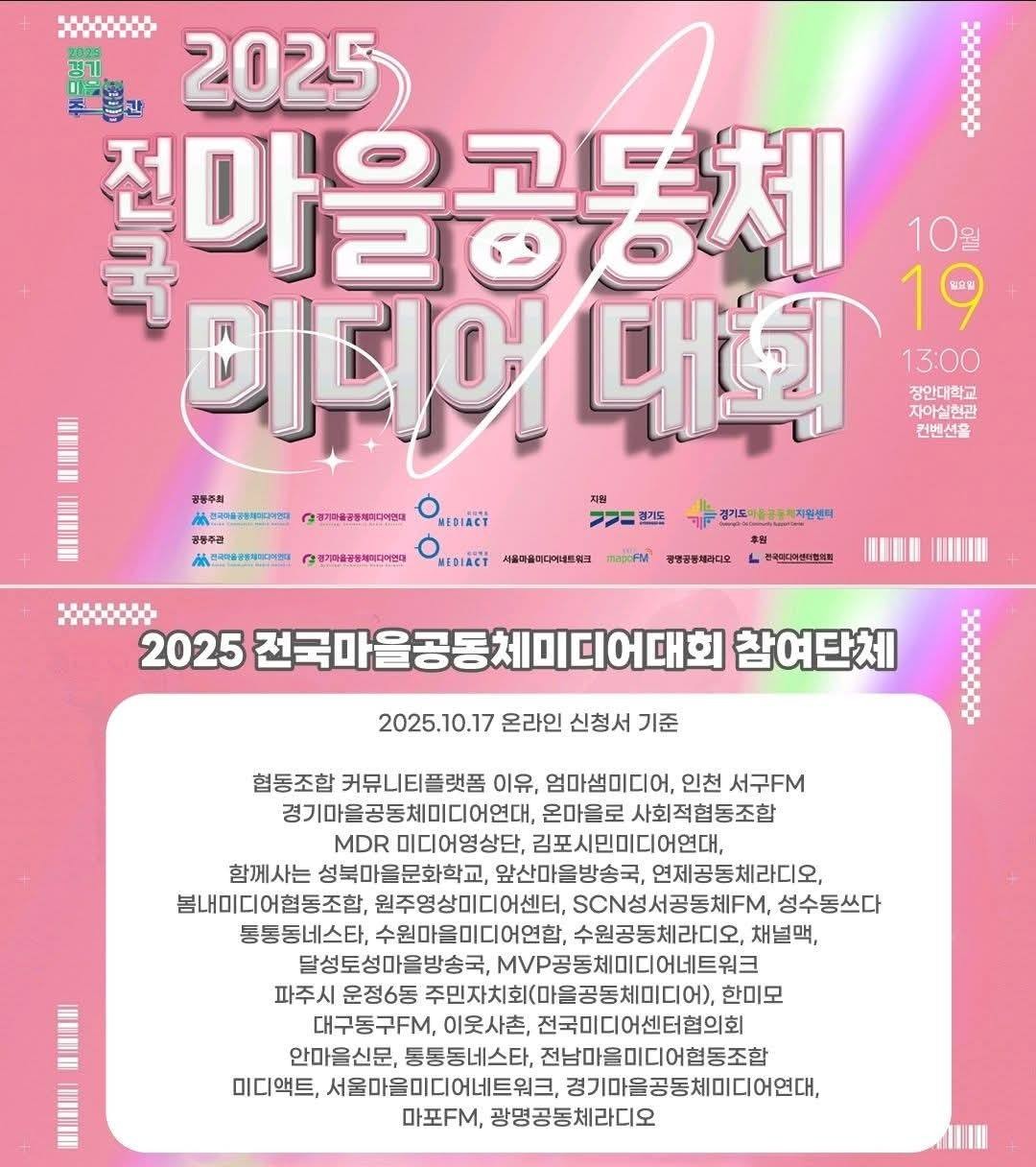 지난 2025년 10월 19일, 고대하던 ‘2025 마을공동체미디어대회’가 장안대학교 화성캠퍼스에서 열렸다. 전국마을공동체미디어연대, 경기마을공동체미디어연대, 미디액트가 주최한 이번 대회는 경기도와 화성시의 주최로 진행된 ‘2025 경기마을주간’과의 협력으로 개최됐다. 대회에서는 대구, 전남을 비롯해 전국의 마을공동체미디어 활동가 50여 명이 이 날 모여 서로의 존재를 확인하고 고민을 나누었다. 2024년에는 아쉽게도 전국대회가 비대면으로 진행되었는데, 2025년에는 보다 서로에게 힘을 줄 수 있는 자리를 만들어보고자 오프라인 행사로 준비하고자 했고 다행히 무사히 개최되었다. 1달여 간의 짧은 준비 시간, 여러모로 넉넉치 않은 여건에도 불구하고 각 지역의 마을공동체미디어들이 힘을 모아 가능했던 자리였다.