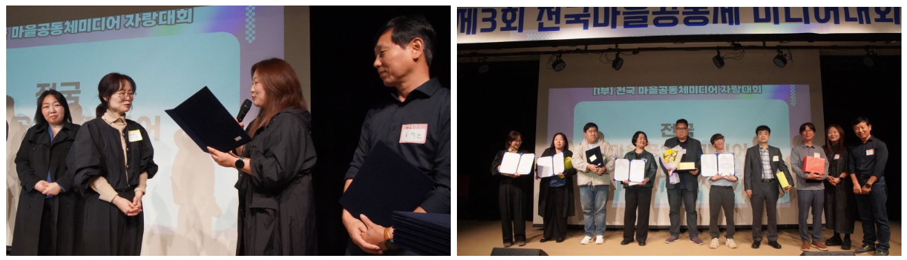그런 와중에 1부에서 나눈 사례에는 ‘고난’만이 담겨있지 않았다. 여전히 누군가는 마을방송국을 시작하고 있었고, 가치 있는 콘텐츠를 함께 만드는 일의 보람과 즐거움을 느끼고 있었다. 이런 사례들이 각 지역에서만의 이야기로 남지 않고 공동의 사례로 발굴된 데에는 대회를 준비한 마을공동체미디어 활동가들의 노력이 컸다. 활동을 이어나가는 데에 어려움을 겪고 있는 곳들에게도 위의 사례들이 다시 한 번 힘을 낼 수 있는 작은 계기가 되었으면 하는 마음이었다. 발표자들에게는 활동가들이 손수 준비한 상장과 선물을 수여했다.