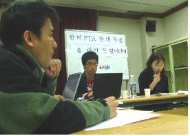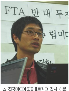 사회자 : 오늘 좌담회는 대안 독립 미디어 진영의 한미FTA 반대 투쟁에 대한 평가를 통해 FTA와 같은 전사회적 이슈에 어떻게 대응하고 어떤 대안들을 마련해 나갈지에 대한 실천적 틀과 방향을 고민하기 위해 마련된 자리입니다. 이 부분에 초점을 두고 함께 토론을 해 나갔으면 좋겠습니다. Ⅰ. 한미FTA 저지 투쟁, 미디어 문화 활동가들은 무엇을 했나? 사회자 : 우선, 참여자들이 속한 단체 혹은 그룹에서 지난 1년 동안 한미FTA를 저지하기 위해 어떤 활동을 하셨는지 소개하면서 시작하도록 하겠습니다. 시청각미디어공대위 :토론회,기자회견 등 시청각 미디어 개방 저지를 위한 다양한 활동 펼쳐 No FTA 액세스프로젝트 : 지역 미디어 활동가들이 중심이 되어 제작프로젝트 진행 에프키라 : 네이버 까페를 통해 한미FTA 내용을 대중들에게 많이 알려내 김형진(시청각미디어공대위) : 시청각미디어공대위는 미디어관련 단체들에 제안을 해서 한미FTA 저지와 시청각 미디어 개방을 막기 위한 활동을 전개한다는 목표로 작년 3월 8일 발족을 했어요. 1년이 조금 넘은 지금까지 6~7차례 토론회를 통해 우리는 어떤 전략을 짤 것 인가에서부터 한미FTA에서 시청각 미디어 분야에서 예상되는 쟁점들을 예상하고 어떻게 막아낼 것인가 등을 논의했습니다. 또 방송위원회와 국정홍보처 등을 대상으로 꾸준히 기자회견을 했고요. 공대위 차원에서 지난한 논의 끝에 몇 분이 방송위원회 자문단에 참여하기도 했습니다. 이밖에 피켓팅이나 방송사 사장들 면담 등의 활동도 진행했습니다. 한범승(No FTA 액세스프로젝트) : 저는 라는 제작프로젝트를 진행하였습니다. FTA투쟁에서 미디어 활동들 대부분이 서울을 중심으로 진행되고 있는 것에 문제의식을 느끼고, 지역의 미디어 활동가들이 FTA투쟁에 함께 참여해야 하지 않겠나 하는 생각에서 이 프로젝트가 시작되었습니다. 처럼 지역 미디어활동가들이 참여하는 공동 프로젝트는 이번이 처음이 아닙니다. 2005년 부산 APEC 투쟁과 홍콩 WTO 반대 투쟁 때에도 지역에서 미디어운동을 하는 사람들과 함께 제작을 통한 공동행동을 했었어요. 이 투쟁 이후에도 공동의 실천을 고민하다가 마침 미디액트와 한독협 실천단 내에서 지역 미디어 활동가 중심으로 “No FTA 미디어제작워크숍”이 진행되었고, 이 워크숍이 끝난 후 지역에서 FTA 반대의 목소리를 만들어보자는 취지로 지금의 프로젝트를 시작되게 된 것입니다. 현재 교육, 에너지, 의약품, 비정규직 노동자에 대한 4편의 작품이 모두 완성된 상태입니다. 작품이 조금 늦게 나왔습니다. 제작이 늦어진 이유는 지역활동가들이 여러 가지 활동을 동시에 하는 상황이었고, 서울과 달리 한 가지 일에만 집중할 수 없는 여건이었기 때문입니다. 시간이 좀 늦어지긴 했지만, 그래도 FTA 반대운동에서 지역 활동가들이 중심이 되어 함께 작업했다는 점이 유의미하다고 생각됩니다. 앞으로 배급, 상영을 어떻게 할지도 고민하고 있습니다. 미디어운동에서 퍼블릭액세스를 많이 이야기해 왔지만, 정작 제작에 대해서는 소홀하지 않았나 하는 평가들도 나오고 있습니다. 미디어센터도 생기고, 미디어교육도 많아지면서 미디어운동의 외형이 많이 넓어지기는 했지만 실질적으로 직접 제작을 통해 행동하고 실천했던 사례는 별로 없었다고 볼 수 있습니다. 구호로만 끝나는 것이 아니라 제작을 통해 실천해보자는 취지에서 제작프로젝트를 지역의 미디어활동가들과 공유해 나가려고 합니다. 지역에서 실질적으로 미디어제작을 하고 있는, 또 제작하려는 움직임이 있는 곳을 찾아가서 이 영상들을 보여주고, 이 프로젝트의 과정을 공유하고, 또 이후에 FTA와 같은 전 사회적 이슈가 있을 때, 함께 준비해 나가자는 것입니다. 이번에는 작품이 좀 뒤늦게 만들어졌지만, 지역미디어운동가들이 미리 만들고 미리 준비할 수 있는 틀거리를 만들려고 합니다. 디 디(에프키라) : 에프키라는 사실 미디어운동을 고민하고 만들어진 곳은 아니에요. 그래서 이 좌담회에 참여해야 하는지도 고민을 많이 했습니다.(웃음) 미디어운동을 고민하면서 한 것은 아니었지만, 활동 방식에서 미디어운동진영에서 참조할 부분이 있었던 것 같습니다. 간단하게 활동을 정리해보면, 에프키라는 연구공간 수유+너머에서 만들어졌고, 작년 3, 4월에 한미FTA에 대한 내용을 공유하면서 이 내용을 대중들에게 많이 알려야겠다는 생각을 공유하게 되었고 어떻게 알리는 게 좋을까 고민하다가 네이버에 까페(http://ftakiller.ba. ro/)를 만들었습니다. FTA에 대한 내용을 읽기 쉬운 내용으로 바꿔서 네이버와 다음 아고라처럼 사람들이 많이 볼 만한 곳에 올렸습니다. 또 이 글들에 추천인 댓글을 달아서 일단 사람들 눈에 띄게 했습니다. 그렇게 하다보니까 FTA 초기에 그런 글들의 조회수가 굉장히 많이 올라가고, 많은 사람들이 보게 되었습니다. 정부에서 FTA Q&A를 내놨을 때에는 그것을 반박하는 A&Q를 만들었는데 이 글들이 운동 진영에서 많이 쓰이기도 했습니다. 또 한편으로는 연구소에 필자들이 많으니까 참세상, 프레시안, 레디앙, 한겨례, 경향 등 선이 닿는 데에 릴레이 기고 글을 올린다거나, 칼럼